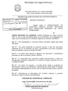 O prefeito Didi homologou hoje dia 08 de Fevereiro de 2021, o resultado final e a classificação dos aprovados para todos os cargos /funções públicas do concurso público da Prefeitura Municipal de Lagoa Formosa. A homologação segue todas as normas constitucionais e demais disposições legais. (Clique em Homologar). HOMOLOGAR