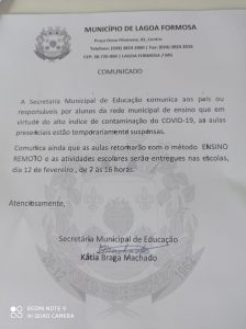 A decisão da prefeitura, através do Comitê Contra o Coronavírus e da secretaria de Educação, foi devido aos números alarmantes de contágio pela Covid-19 registrados em nossa cidade nos últimos dias. Ficou estabelecido que o retorno será somente via remoto em formato complementar a fim de evitar aglomerações.
