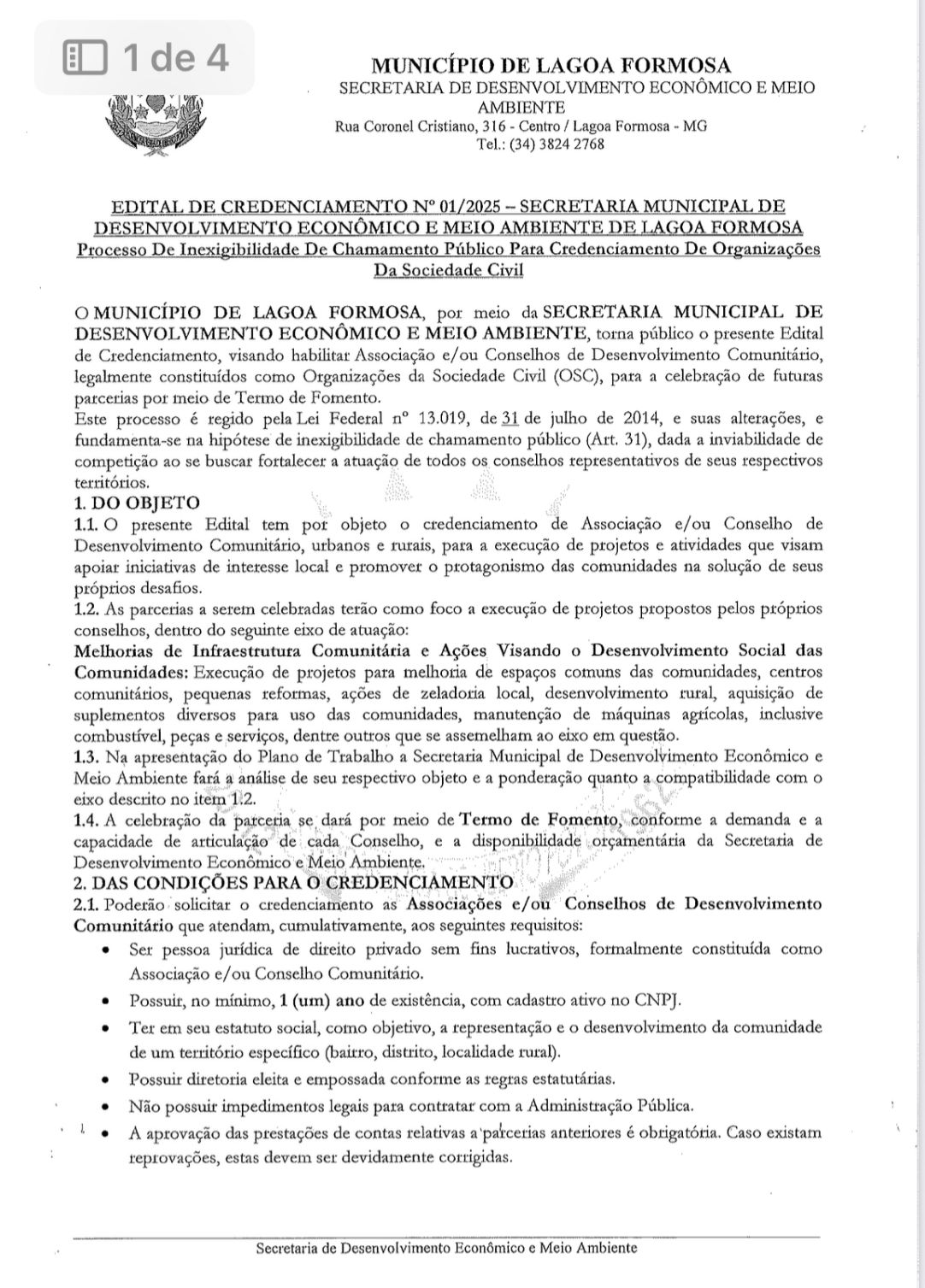 O MUNICÍPIO DE LAGOA FORMOSA, por meio da SECRETARIA MUNICIPAL DE DESENVOLVIMENTO ECONÔMICO E MEIO AMBIENTE, torna público o presente Edital de Credenciamento, visando habilitar Associação e/ou Conselhos de Desenvolvimento Comunitário, legalmente constituídos como Organizações da Sociedade Civil (OSC), para a celebração de futuras parcerias por meio de Termo de Fomento.