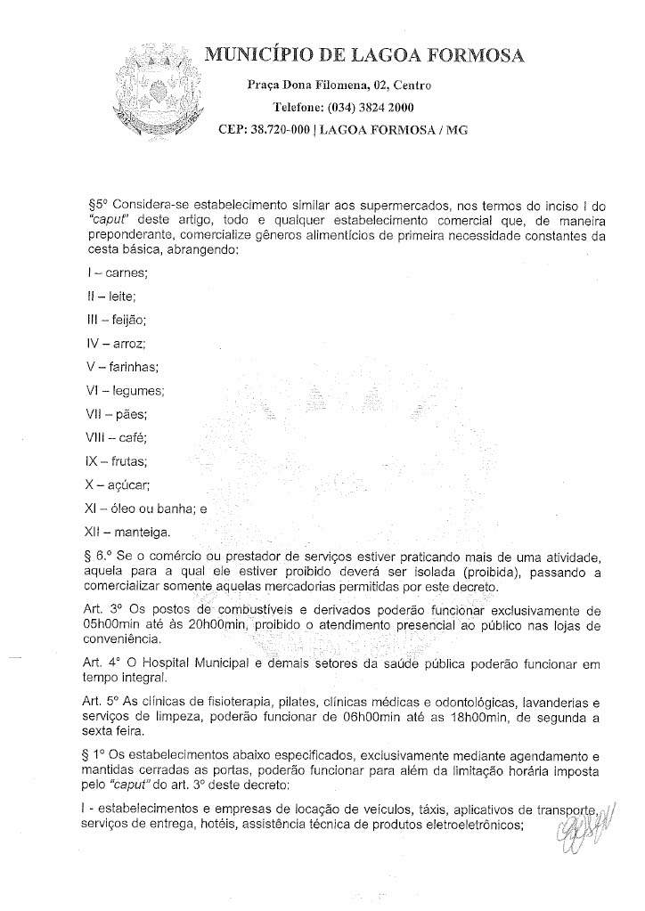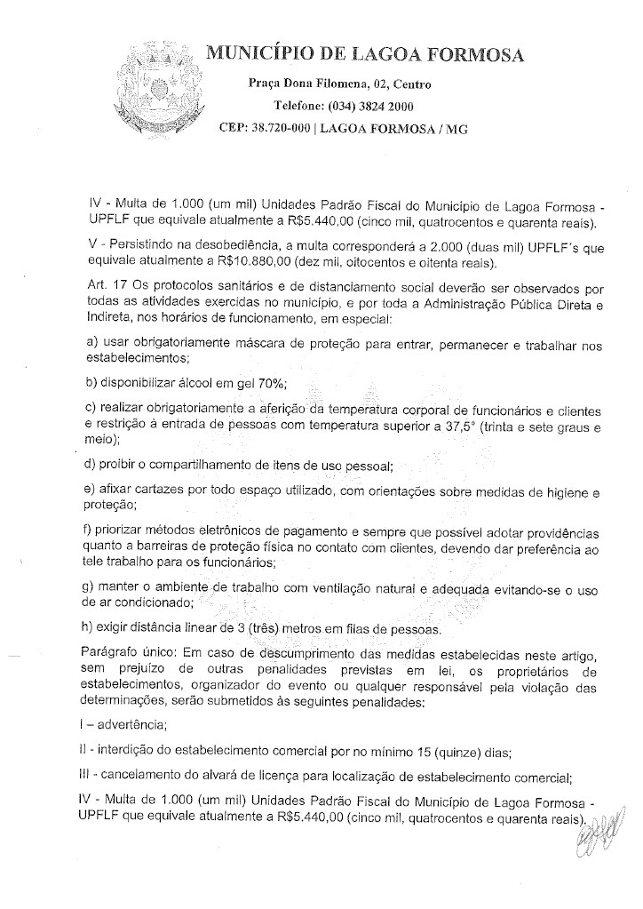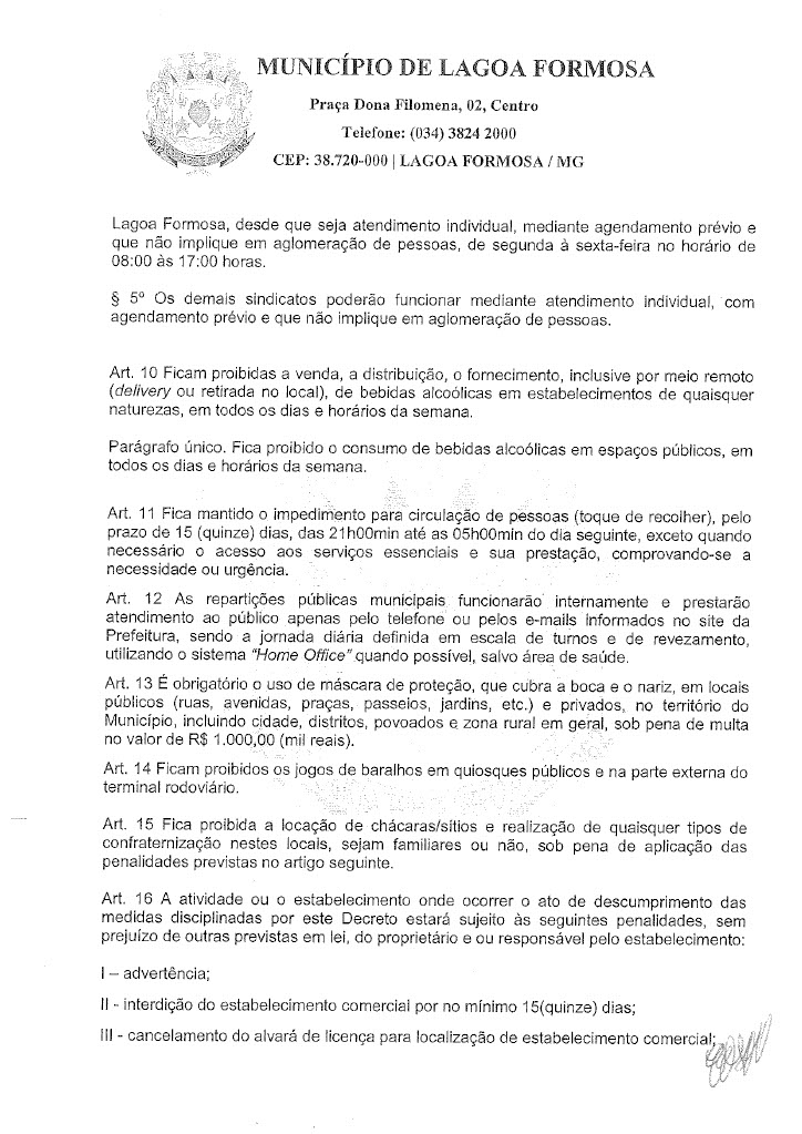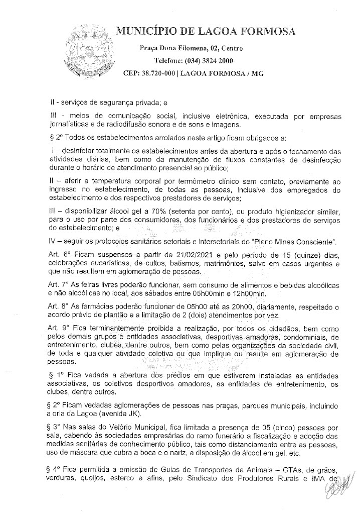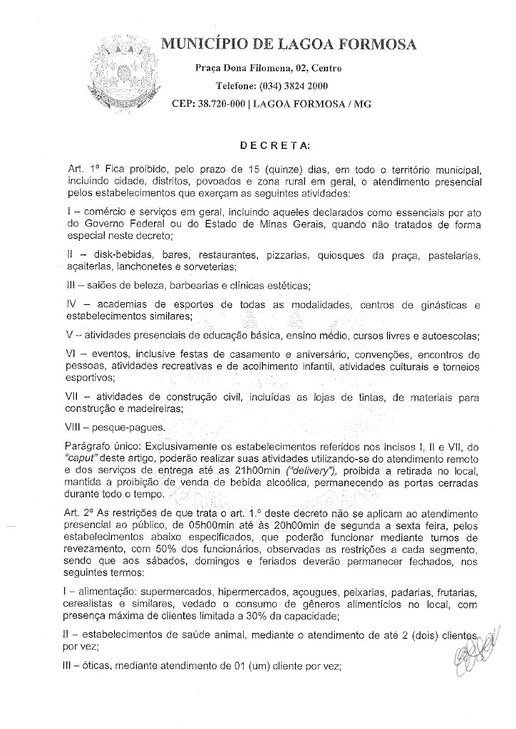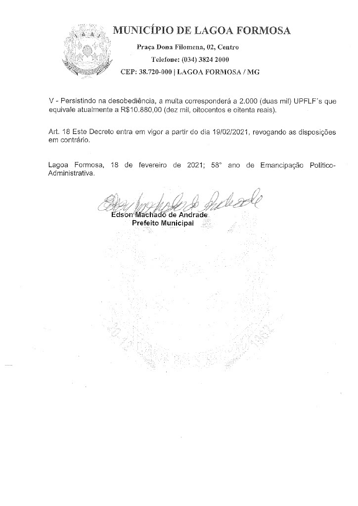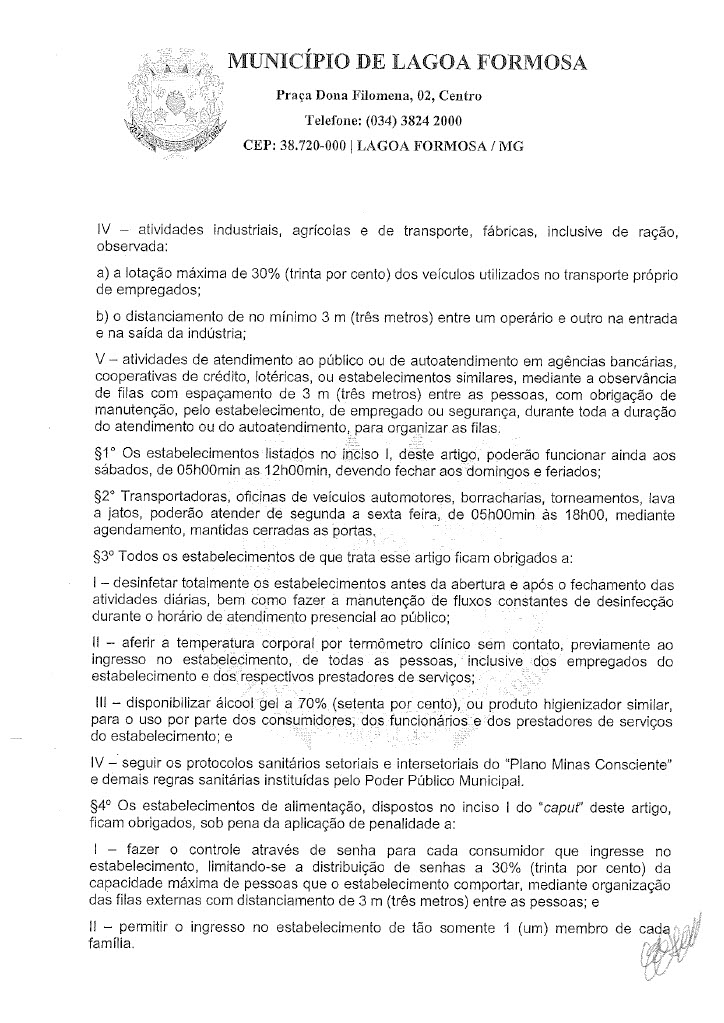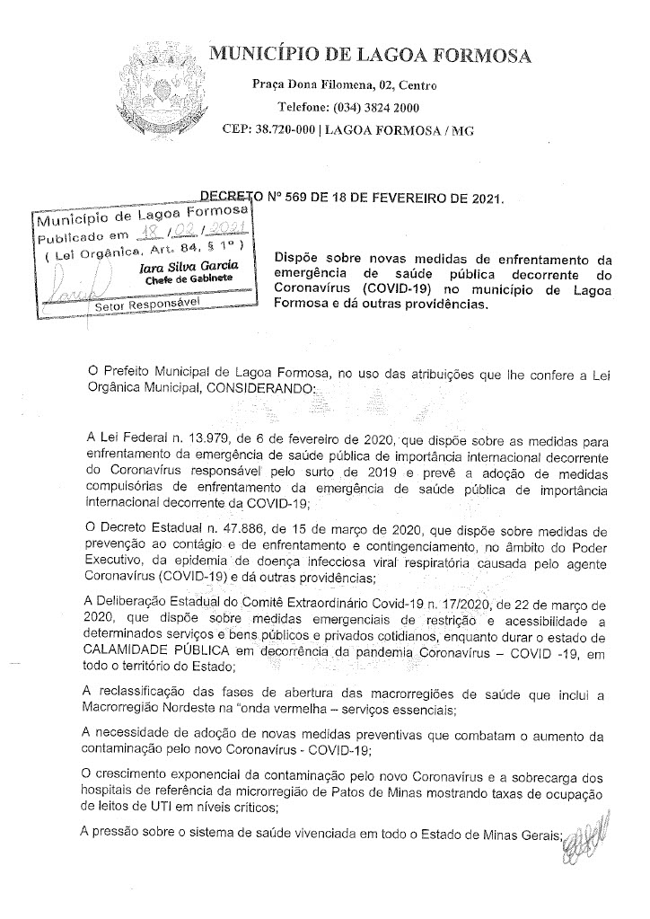 Em reunião nesta quinta-feira (18) o Comitê de enfrentamento ao Covid-19 de Lagoa Formosa definiu novas restrições. Com a grande taxa de ocupação de leitos clínicos e de Unidade de Terapia Intensiva (UTI) e a dificuldade de contratação de profissionais de saúde para atuarem no tratamento de casos suspeitos e confirmados de Covid-19 em Lagoa Formosa e região, o Comitê de Enfrentamento à doença definiu novas regras de restrições na cidade. O objetivo é reduzir a velocidade do contágio do coronavírus e o número de casos confirmados no município.