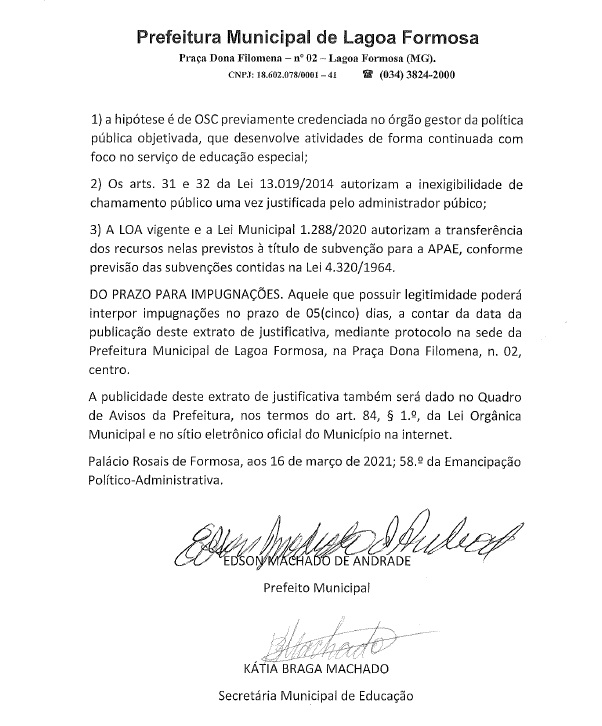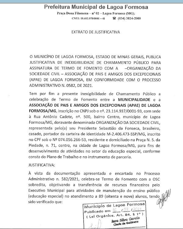 Administração Municipal formaliza parceria com a APAE para investimentos na educação especial. Abaixo o extrato com resumo da justificativa de inexigibilidade de chamamento público para assinatura do Termo de Fomento